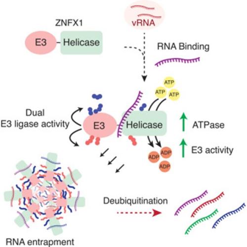 This is the first time an immune factor has been found to combine these two specific activities in a single polypeptide. By using ATP as fuel to bind to viral RNA, ZNFX1 triggers a "two-component ubiquitin circuit." This circuit works in parallel, triggering two different ubiquitin molecular signals: one that destroys the protein, and another that acts as "glue."