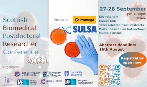 Register and submit your abstracts here (https://www.eventbrite.co.uk/e/scottish-biomedical-postdoctoral-researcher-conference-2021-tickets-162650216175) before the deadline of 16th August.